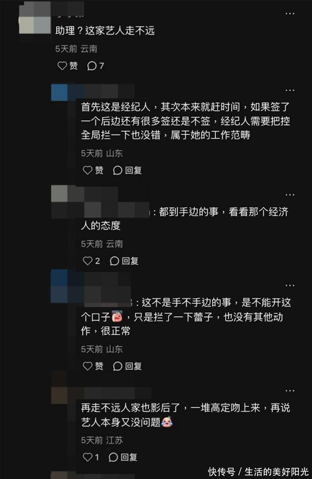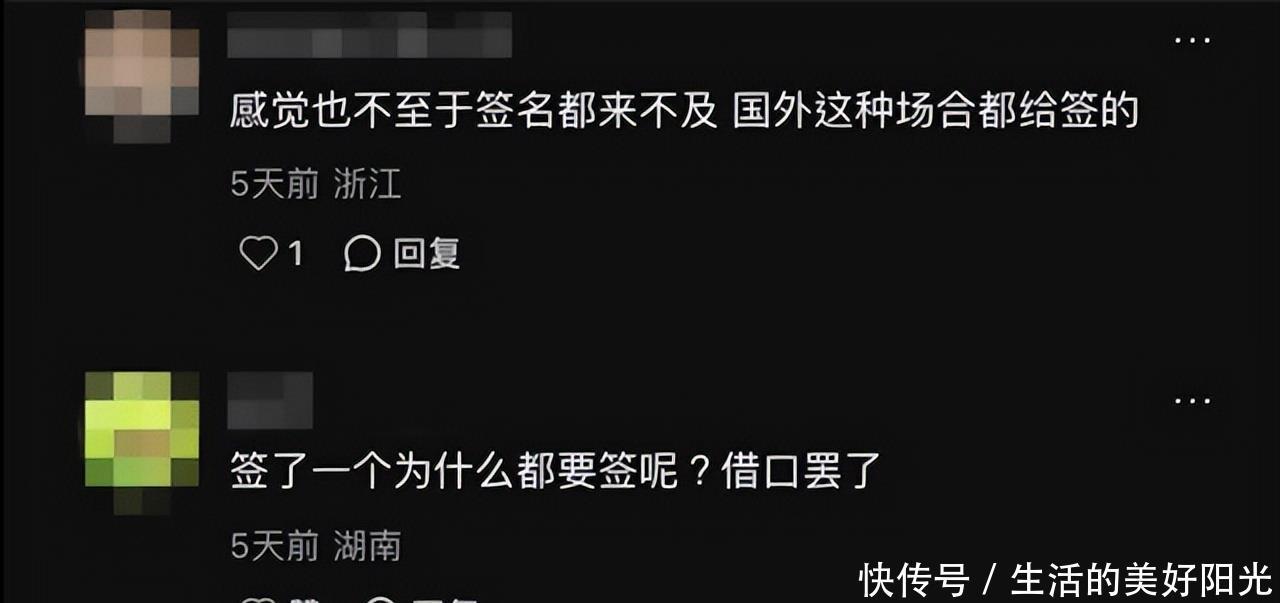 经理人的不友好举动,亦令辛芷蕾遭“连累”。有网民认为,经理人只是“做丑人”,真正要求可能是来自艺人本人:“都是艺人要求这样做的,坏人给经纪人做。”不过,亦有网民为经理人平反,认为这是其职责所在:“首先这是经纪人,其次本来就赶时间,如果签了一个后边还有很多签还是不签,经纪人需要把控全局拦一下也没错,属于她的工作范畴。”儘管如此,反驳的声音认为,即使赶时间,经理人的处理方式亦大有问题:“不让签说一嘴不行啊 不好意思 赶时间 没时间签名 很难说吗”。看来辛芷蕾的团队在公关方面,需要好好检讨,始终粉丝就是艺人的最大后盾。